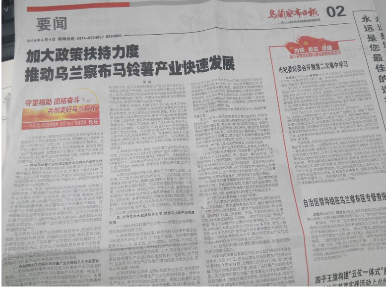 4月4日,烏蘭察布日報發(fā)表內(nèi)蒙古民豐薯業(yè)有限公司總經(jīng)理張國關(guān)于《加大政策扶持力度,助推馬鈴薯產(chǎn)業(yè)快速發(fā)展》的文章,文章指出:
